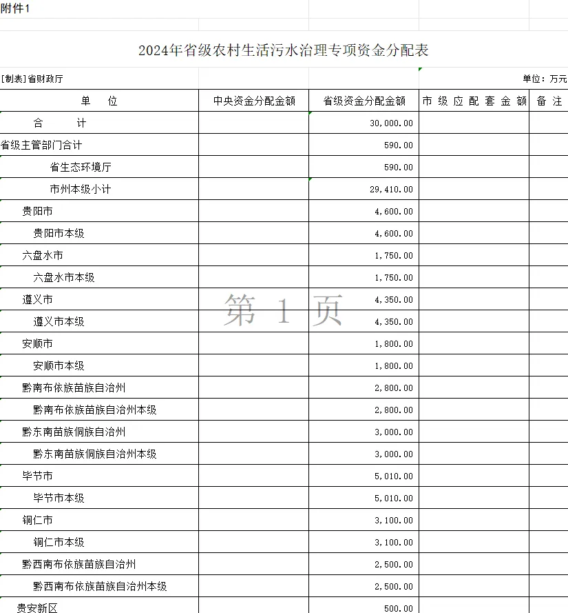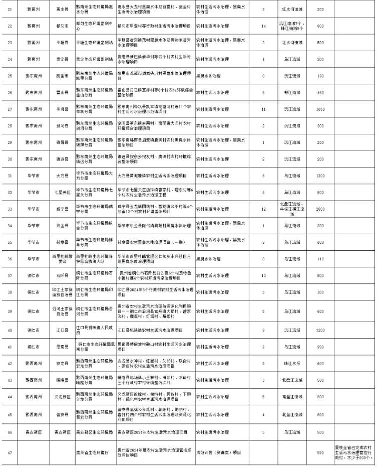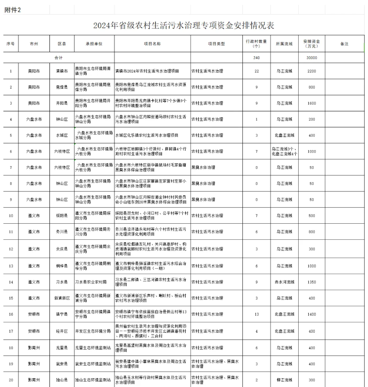 貴州省財(cái)政廳、貴州省生態(tài)環(huán)境廳發(fā)布關(guān)于下達(dá)2024年省級(jí)農(nóng)村生活污水治理專項(xiàng)資金的通知,下達(dá)2024年省級(jí)農(nóng)村生活污水治理專項(xiàng)資金30000萬(wàn)元,用于支持240個(gè)行政村農(nóng)村生活污水治理、12條黑臭水體治理。