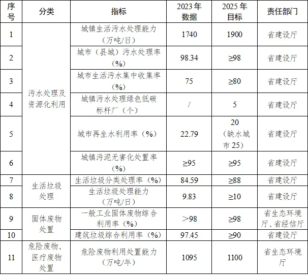 污水處理及資源化利用。到2025年,全省城鎮(zhèn)生活污水處理能力達(dá)到1900萬噸/日,全省城市(縣城)污水處理率達(dá)到98%以上,城市生活污水集中收集率力爭達(dá)到80%以上;進(jìn)水五日生化需氧量(BOD5)濃度高于100毫克/升的城市污水處理廠規(guī)模占比達(dá)到90%以上或較2022年提高5個百分點;打造5個以上城鎮(zhèn)污水處理綠色低碳標(biāo)桿廠;全面完成接入城鎮(zhèn)污水處理廠的市政污水管網(wǎng)和工業(yè)園區(qū)集中污水處理設(shè)施的配套污水管網(wǎng)(均含提升泵站等附屬設(shè)施)隱患排查工作,有序推進(jìn)問題管網(wǎng)提升改造任務(wù);全省各城市再生水利用率不低于20%,其中缺水城市不低于25%。城鎮(zhèn)污泥無害化處置率不低于95%。
