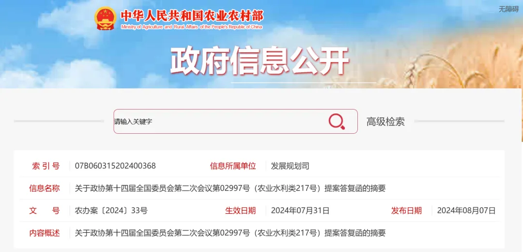 關(guān)于政協(xié)第十四屆全國委員會(huì)第二次會(huì)議第02997號(農(nóng)業(yè)水利類217號)提案答復(fù)函的摘要