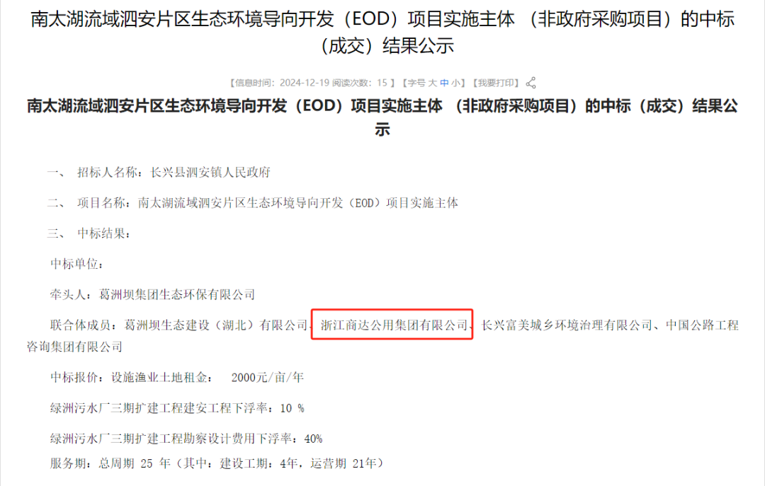 近日,商達(dá)公用集團(tuán)作為聯(lián)合體成員中標(biāo)南太湖流域泗安片區(qū)生態(tài)環(huán)境導(dǎo)向開(kāi)發(fā)(EOD)項(xiàng)目,項(xiàng)目總投資29.7億元。
