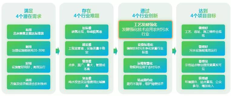 農村污水治理4.0農村污水治理4.0是一個系統(tǒng),其內涵概況起來,主要包含了4個“4”,分別為滿足4個潛在需求、存在4個行業(yè)難題、通過4個行業(yè)創(chuàng)新、達到4個項目目標,最終要達到的是提升村民獲得感,也是農村人居環(huán)境建設的出發(fā)點和落腳點。