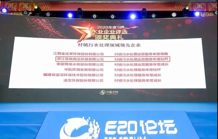 雙良商達(dá)榮獲“2020年度水業(yè)細(xì)分領(lǐng)域領(lǐng)跑及單項能力領(lǐng)跑企業(yè)——村鎮(zhèn)污水處理運(yùn)營服務(wù)年度標(biāo)桿”獎。