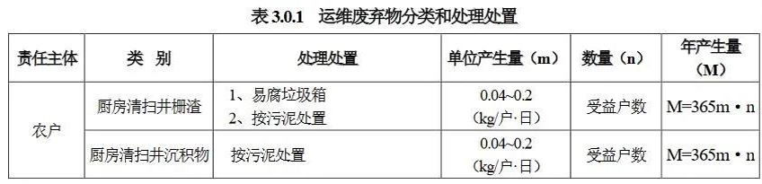 3.0.4 運維廢棄物應按廢棄物種類、性質(zhì)和數(shù)量選擇合理的處置方式,可分為納入農(nóng)村垃圾系統(tǒng)、污泥處理廠處理、有機廢棄物處理處置中心處理、糞便處理廠和專業(yè)公司回收處理等方式。