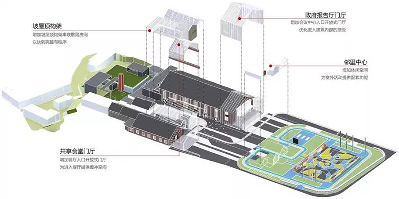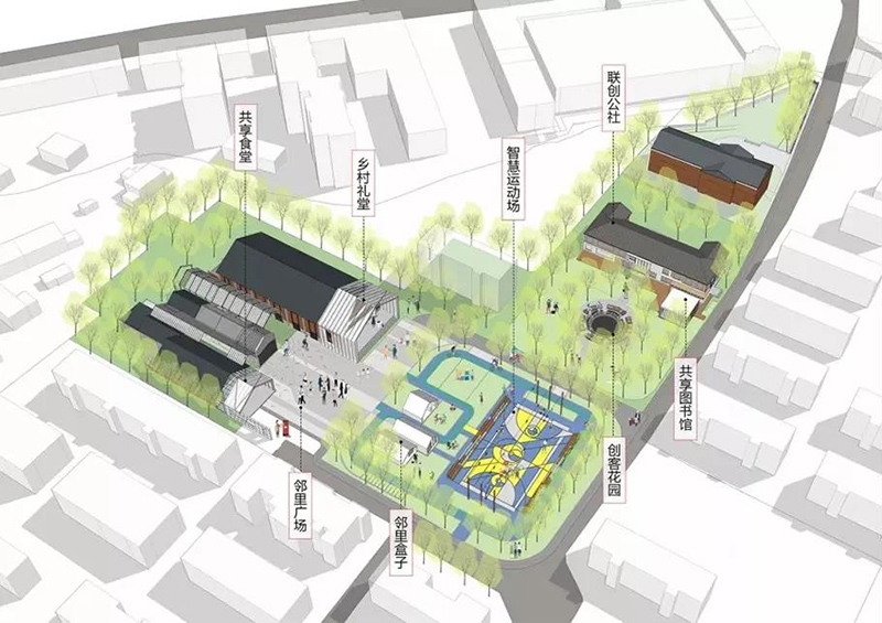 對(duì)于這樣一個(gè)以工業(yè)遺存為主的舊改項(xiàng)目,溪口未來社區(qū)以“溪口公社·快樂老家”為主旨,提出了“鄉(xiāng)里、鄉(xiāng)味、鄉(xiāng)情、鄉(xiāng)鄰、鄉(xiāng)業(yè)、鄉(xiāng)教、鄉(xiāng)健、鄉(xiāng)談”的“八鄉(xiāng)”改造策略,而這些場(chǎng)景活化的振興策略則在遍布社區(qū)中的共享食堂、鄉(xiāng)村禮堂、智慧運(yùn)動(dòng)場(chǎng)、聯(lián)創(chuàng)公社、鄰里廣場(chǎng)、鄰里盒子、創(chuàng)客空間和共享圖書館等社區(qū)公共空間有所體現(xiàn)。