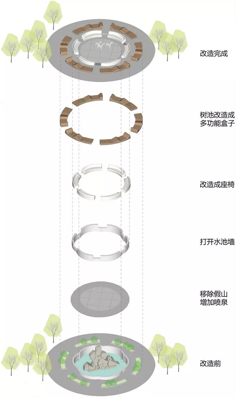 作為工業(yè)遺存,“田園化”的屬性在溪口未來社區(qū)身上并不突出,但是這并不意味著當(dāng)?shù)夭恢匾暽鷳B(tài)建設(shè)。以創(chuàng)客花園為例,當(dāng)?shù)匾暂p介入的設(shè)計(jì)手法改造水池,移除水池中雜亂的假山,改造為鋼格柵打底的旱噴水池壁與外部種植池被改造成花瓣型趣味座椅,成為一處輕松舒適、體驗(yàn)低碳鄰里互動(dòng)的空間。封閉的空間被打開后,旱噴泉成為當(dāng)?shù)鼐用駩芤庀硎艿淖罴讶ヌ帯?/span>