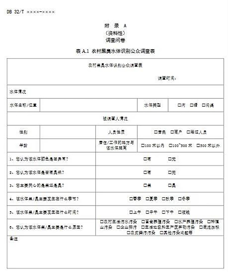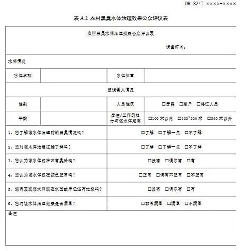 感官判斷有爭議的水體,可通過問卷調(diào)查開展公眾評議判斷水體黑臭狀況。每個(gè)水體的調(diào)查問卷有效數(shù)量不宜少于 30 份,認(rèn)為有“黑”或“臭”問題的人數(shù)占被調(diào)查人數(shù) 60%以上,識別為黑臭水體。