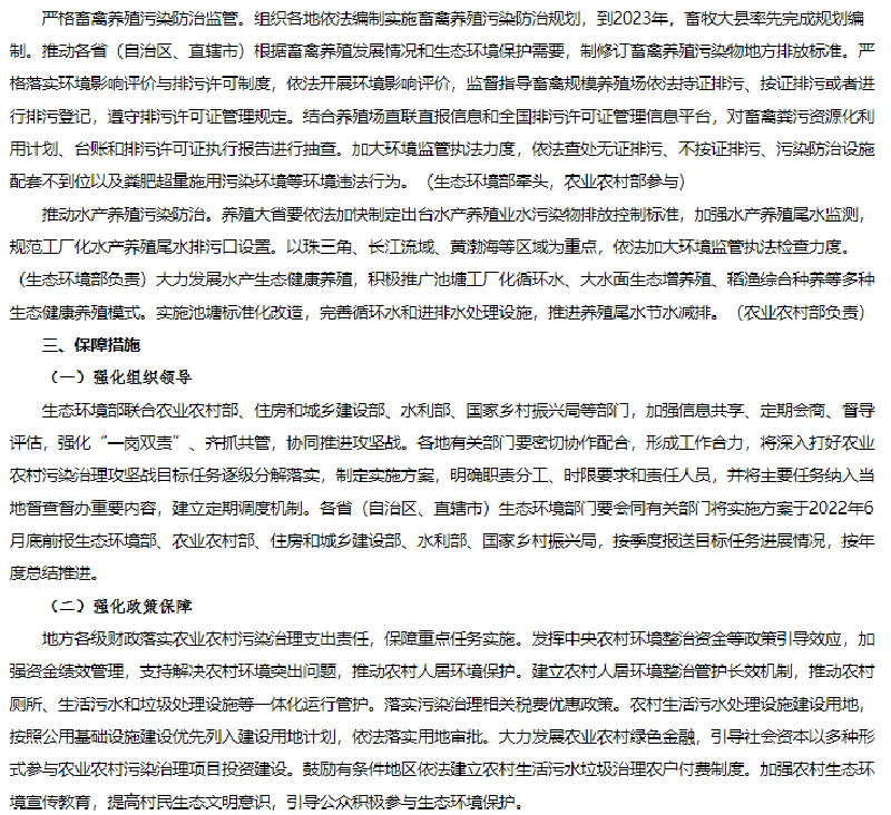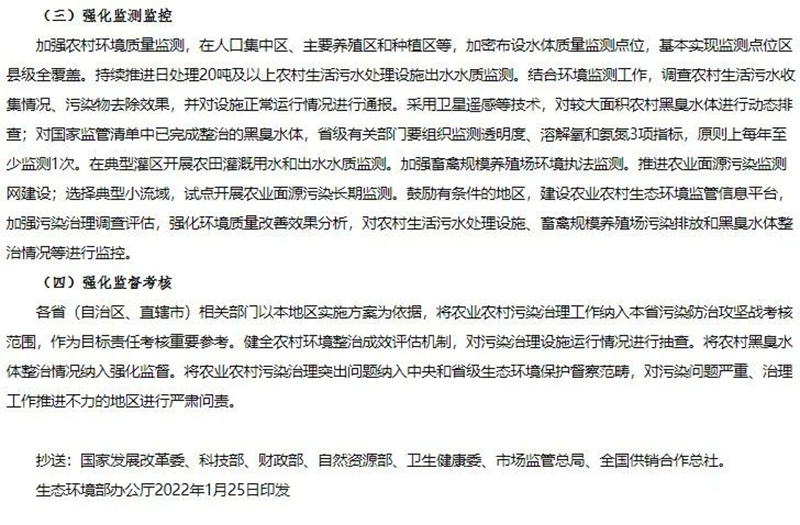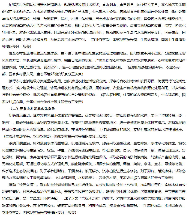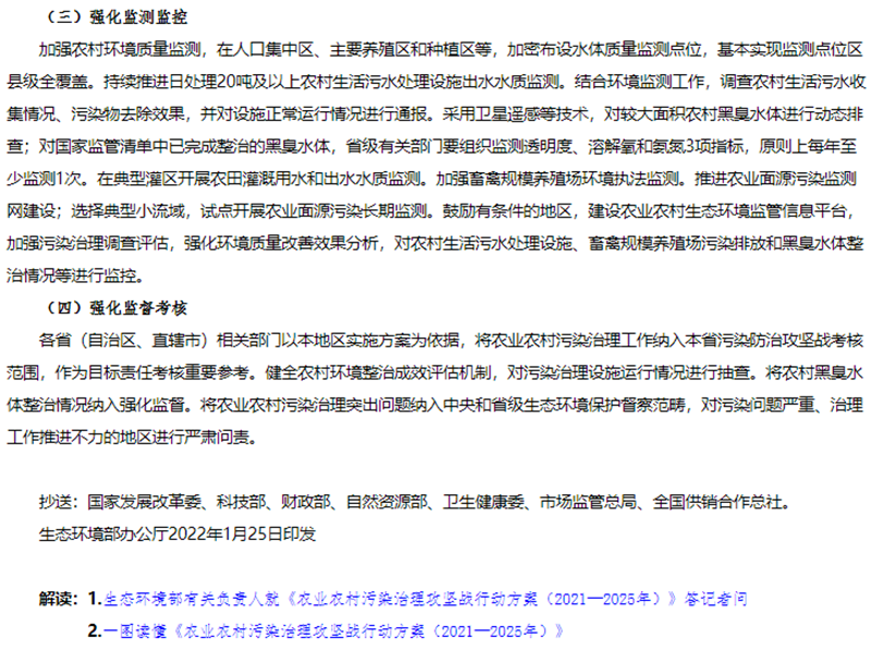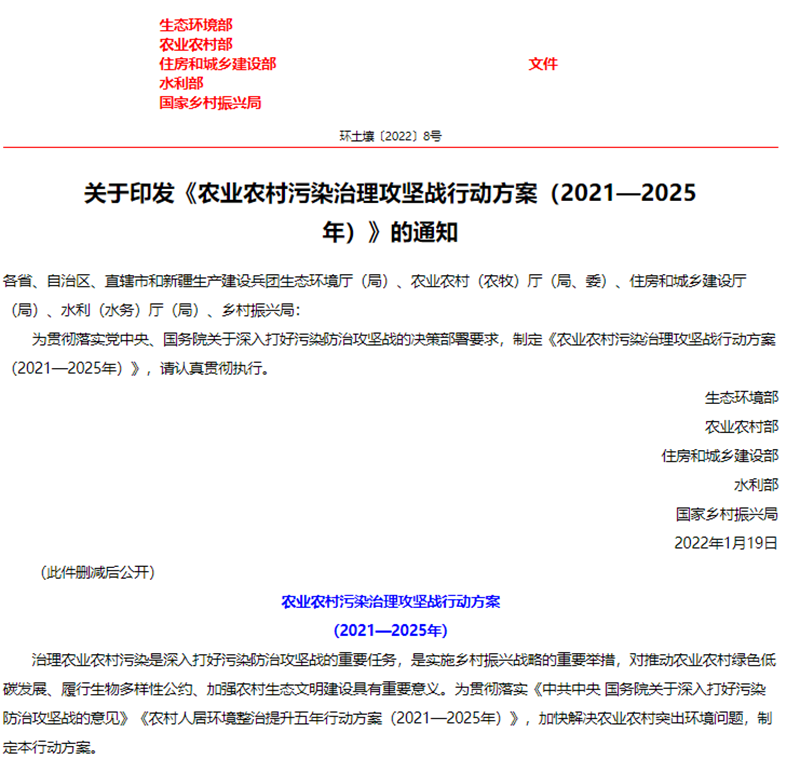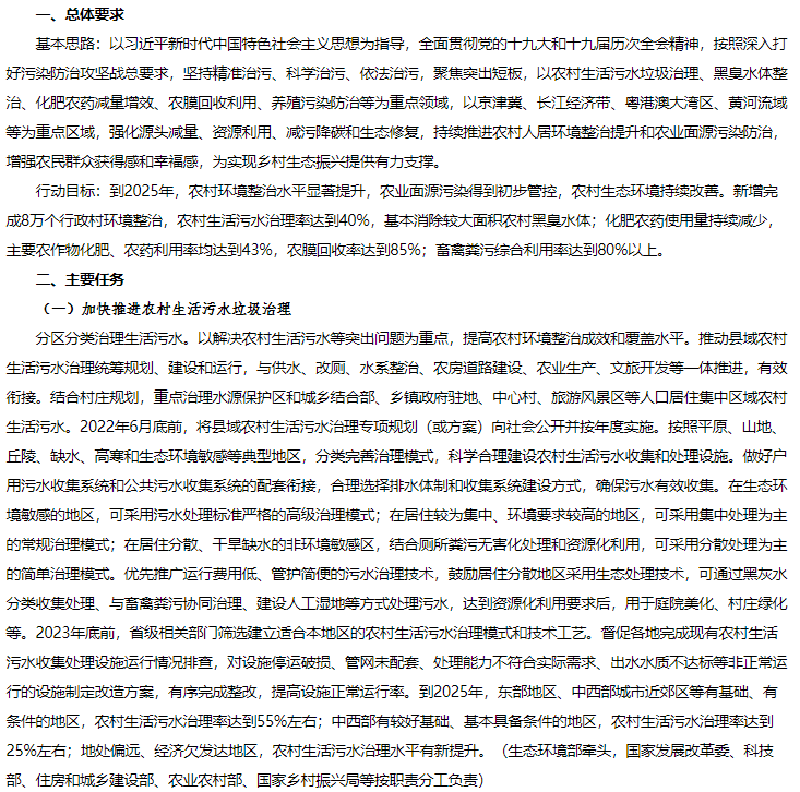 1月25日,生態(tài)環(huán)境部、農(nóng)業(yè)農(nóng)村部、住房和城鄉(xiāng)建設(shè)部、水利部、國家鄉(xiāng)村振興局聯(lián)合發(fā)布《農(nóng)業(yè)農(nóng)村污染治理攻堅戰(zhàn)行動方案(2021—2025年)》的通知。方案指出到2025年,農(nóng)村環(huán)境整治水平顯著提升,農(nóng)業(yè)面源污染得到初步管控,農(nóng)村生態(tài)環(huán)境持續(xù)改善。新增完成8萬個行政村環(huán)境整治,農(nóng)村生活污水治理率達(dá)到40%,基本消除較大面積農(nóng)村黑臭水體;化肥農(nóng)藥使用量持續(xù)減少,主要農(nóng)作物化肥、農(nóng)藥利用率均達(dá)到43%,農(nóng)膜回收率達(dá)到85%;畜禽糞污綜合利用率達(dá)到80%以上。《方案》指出在2021年至2025年農(nóng)業(yè)農(nóng)村污染治理攻堅具有以下任務(wù):(一)加快推進(jìn)農(nóng)村生活污水垃圾治理分區(qū)分類治理生活污水。以解決農(nóng)村生活污水等突出問題為重點(diǎn),提高農(nóng)村環(huán)境整治成效和覆蓋水平。推動縣域農(nóng)村生活污水治理統(tǒng)籌規(guī)劃、建設(shè)和運(yùn)行,與供水、改廁、水系整治、農(nóng)房道路建設(shè)、農(nóng)業(yè)生產(chǎn)、文旅開發(fā)等一體推進(jìn),有效銜接。結(jié)合村莊規(guī)劃,重點(diǎn)治理水源保護(hù)區(qū)和城鄉(xiāng)結(jié)合部、鄉(xiāng)鎮(zhèn)政府駐地、中心村、旅游風(fēng)景區(qū)等人口居住集中區(qū)域農(nóng)村生活污水。2022年6月底前,將縣域農(nóng)村生活污水治理專項規(guī)劃(或方案)向社會公開并按年度實施。按照平原、山地、丘陵、缺水、高寒和生態(tài)環(huán)境敏感等典型地區(qū),分類完善治理模式,科學(xué)合理建設(shè)農(nóng)村生活污水收集和處理設(shè)施。做好戶用污水收集系統(tǒng)和公共污水收集系統(tǒng)的配套銜接,合理選擇排水體制和收集系統(tǒng)建設(shè)方式,確保污水有效收集。在生態(tài)環(huán)境敏感的地區(qū),可采用污水處理標(biāo)準(zhǔn)嚴(yán)格的高級治理模式;在居住較為集中、環(huán)境要求較高的地區(qū),可采用集中處理為主的常規(guī)治理模式;在居住分散、干旱缺水的非環(huán)境敏感區(qū),結(jié)合廁所糞污無害化處理和資源化利用,可采用分散處理為主的簡單治理模式。優(yōu)先推廣運(yùn)行費(fèi)用低、管護(hù)簡便的污水治理技術(shù),鼓勵居住分散地區(qū)采用生態(tài)處理技術(shù),可通過黑灰水分類收集處理、與畜禽糞污協(xié)同治理、建設(shè)人工濕地等方式處理污水,達(dá)到資源化利用要求后,用于庭院美化、村莊綠化等。2023年底前,省級相關(guān)部門篩選建立適合本地區(qū)的農(nóng)村生活污水治理模式和技術(shù)工藝。督促各地完成現(xiàn)有農(nóng)村生活污水收集處理設(shè)施運(yùn)行情況排查,對設(shè)施停運(yùn)破損、管網(wǎng)未配套、處理能力不符合實際需求、出水水質(zhì)不達(dá)標(biāo)等非正常運(yùn)行的設(shè)施制定改造方案,有序完成整改,提高設(shè)施正常運(yùn)行率。到2025年,東部地區(qū)、中西部城市近郊區(qū)等有基礎(chǔ)、有條件的地區(qū),農(nóng)村生活污水治理率達(dá)到55%左右;中西部有較好基礎(chǔ)、基本具備條件的地區(qū),農(nóng)村生活污水治理率達(dá)到25%左右;地處偏遠(yuǎn)、經(jīng)濟(jì)欠發(fā)達(dá)地區(qū),農(nóng)村生活污水治理水平有新提升。(生態(tài)環(huán)境部牽頭,國家發(fā)展改革委、科技部、住房和城鄉(xiāng)建設(shè)部、農(nóng)業(yè)農(nóng)村部、國家鄉(xiāng)村振興局等按職責(zé)分工負(fù)責(zé))加強(qiáng)農(nóng)村改廁與生活污水治理銜接。科學(xué)選擇改廁技術(shù)模式,宜水則水、宜旱則旱。加快研發(fā)干旱、寒冷地區(qū)衛(wèi)生廁所適用技術(shù)和產(chǎn)品。在水沖式廁所改造中積極推廣節(jié)水型、少水型水沖設(shè)施。因地制宜推進(jìn)廁所糞污分散處理、集中處理與納入污水管網(wǎng)統(tǒng)一處理,鼓勵聯(lián)戶、聯(lián)村、村鎮(zhèn)一體處理。已完成水沖式廁所改造的地區(qū),具備污水收集處理條件的,優(yōu)先將廁所糞污納入生活污水收集和處理系統(tǒng);暫時無法納入污水收集處理系統(tǒng)的,應(yīng)建立廁所糞污收集、儲存、資源化利用體系,避免化糞池出水直排。計劃開展水沖式廁所改造的地區(qū),鼓勵將改廁與生活污水治理同步設(shè)計、同步建設(shè)、同步運(yùn)營;暫時無法同步建設(shè)的,預(yù)留后續(xù)污水治理空間。(農(nóng)業(yè)農(nóng)村部、國家鄉(xiāng)村振興局、生態(tài)環(huán)境部、國家衛(wèi)生健康委等按職責(zé)分工負(fù)責(zé))健全農(nóng)村生活垃圾收運(yùn)處置體系。在不便于集中收集處置農(nóng)村生活垃圾的地區(qū),因地制宜采用小型化、分散化的無害化處理方式,降低設(shè)施建設(shè)和運(yùn)行成本。完善日常巡檢機(jī)制,嚴(yán)厲查處在農(nóng)村地區(qū)飲用水水源地周邊、農(nóng)村黑臭水體沿岸隨意傾倒、填埋垃圾行為。到2025年,進(jìn)一步健全農(nóng)村生活垃圾收運(yùn)處置體系。(住房和城鄉(xiāng)建設(shè)部牽頭,農(nóng)業(yè)農(nóng)村部、國家鄉(xiāng)村振興局、生態(tài)環(huán)境部等按職責(zé)分工負(fù)責(zé))推行農(nóng)村生活垃圾分類減量與利用。