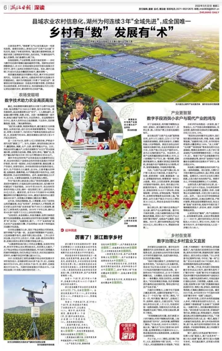 白茶采收季節(jié),“倒春寒”天氣讓安吉溪龍鄉(xiāng)一些茶農(nóng)發(fā)愁。望著百畝茶山,茶農(nóng)們點(diǎn)開“白茶產(chǎn)業(yè)大腦”手機(jī)應(yīng)用,發(fā)起了專家實(shí)時咨詢?!白罱⒁獠铇浔?,在做好采茶工疫情防護(hù)的同時,及時采收?!甭犞r(nóng)技和氣象人員解答,他們懸著的心落了地。 農(nóng)場變聰明,產(chǎn)業(yè)更智慧,治理手段在變革……鄉(xiāng)村與數(shù)字化在湖州碰撞出越來越多的可能。國家農(nóng)業(yè)農(nóng)村部數(shù)據(jù)顯示,在2021全國縣域農(nóng)業(yè)農(nóng)村信息化發(fā)展水平評價中,該市三縣兩區(qū)全部獲評先進(jìn)縣。至此,湖州已連續(xù)三年成為先進(jìn)縣全覆蓋的地級市,屬全國唯一。 高質(zhì)量發(fā)展建設(shè)共同富裕示范區(qū),離不開農(nóng)業(yè)農(nóng)村現(xiàn)代化。而信息化、數(shù)字化,無疑是評價現(xiàn)代化發(fā)展水平的重要表征。湖州為何能連續(xù)三年拿下“全域先進(jìn)”?榮譽(yù)背后有何發(fā)展秘訣?信息技術(shù)和數(shù)字思維,怎樣推動農(nóng)業(yè)高質(zhì)高效、鄉(xiāng)村宜居宜業(yè)、農(nóng)民富裕富足先行示范?記者走訪湖州鄉(xiāng)村,看田野阡陌之間新氣象。數(shù)字技術(shù)助力農(nóng)業(yè)高質(zhì)高效 最近,地處德清阜溪街道的水木莫干山都市農(nóng)業(yè)綜合體,每天都能產(chǎn)出1500公斤番茄,發(fā)往全國市場。更有意思的,是這些番茄都長在“空中”。工人乘軌道車,在玻璃大棚中穿梭、采摘、分揀。水肥一體滴灌系統(tǒng)一刻不休,給每只番茄“投喂”均勻、充足的養(yǎng)分。在遠(yuǎn)程管控平臺中心,技術(shù)人員阿爾法正處理數(shù)據(jù)、下達(dá)指令,實(shí)時調(diào)整溫度、濕度、二氧化碳等指標(biāo)。