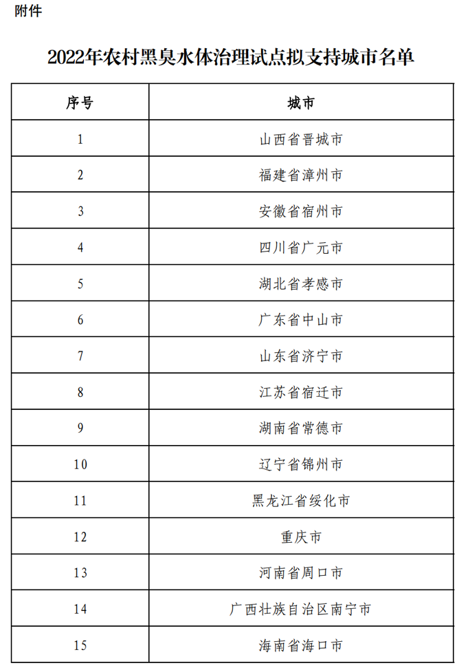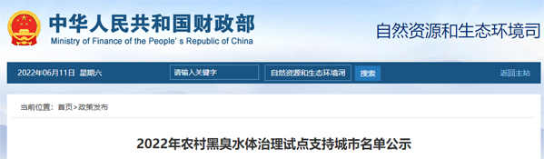 近日,財政部印發(fā)《2022年農(nóng)村黑臭水體治理試點支持城市名單公示》,擬將山西省晉城市、福建省漳州市等15個城市確定為2022年支持的農(nóng)村黑臭水體治理試點城市,詳情如下:2022年農(nóng)村黑臭水體治理試點支持城市名單公示按照《財政部辦公廳 生態(tài)環(huán)境部辦公廳關(guān)于開展2022年農(nóng)村黑臭水體治理試點工作的通知》(財辦資環(huán)〔2022〕5號)要求,財政部會同生態(tài)環(huán)境部組織專家對各地農(nóng)村黑臭水體治理申報城市實施方案進行了競爭性評審。根據(jù)競爭性評審結(jié)果,擬將15個城市確定為2022年支持的農(nóng)村黑臭水體治理試點城市(詳見附件)。現(xiàn)將結(jié)果予以公示,公示期2022年6月10日至2022年6月16日。如有意見,請以書面(實名)形式反饋財政部自然資源和生態(tài)環(huán)境司、生態(tài)環(huán)境部土壤生態(tài)環(huán)境司。 附件:2022年農(nóng)村黑臭水體治理試點擬支持城市名單 聯(lián)系電話:010-61965527 010-65645718 財政部自然資源和生態(tài)環(huán)境司生態(tài)環(huán)境部土壤生態(tài)環(huán)境司 2022年6月10日