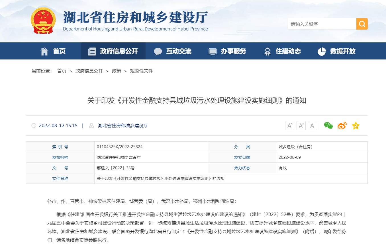 近日,湖北省住建廳發(fā)布關(guān)于印發(fā)《開發(fā)性金融支持縣域垃圾污水處理設(shè)施建設(shè)實(shí)施細(xì)則》的通知,力爭完成“十四五”期間湖北省縣域垃圾污水處理設(shè)施高標(biāo)準(zhǔn)全覆蓋的工作目標(biāo)。