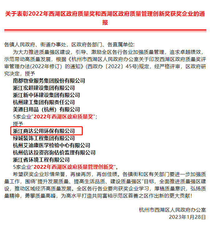 近日,杭州市西湖區(qū)人民政府發(fā)布“關(guān)于表彰2022年西湖區(qū)政府質(zhì)量獎和西湖區(qū)政府質(zhì)量管理創(chuàng)新獎獲獎企業(yè)”的通報,商達(dá)公用榮獲“2022年西湖區(qū)政府質(zhì)量管理創(chuàng)新獎”。