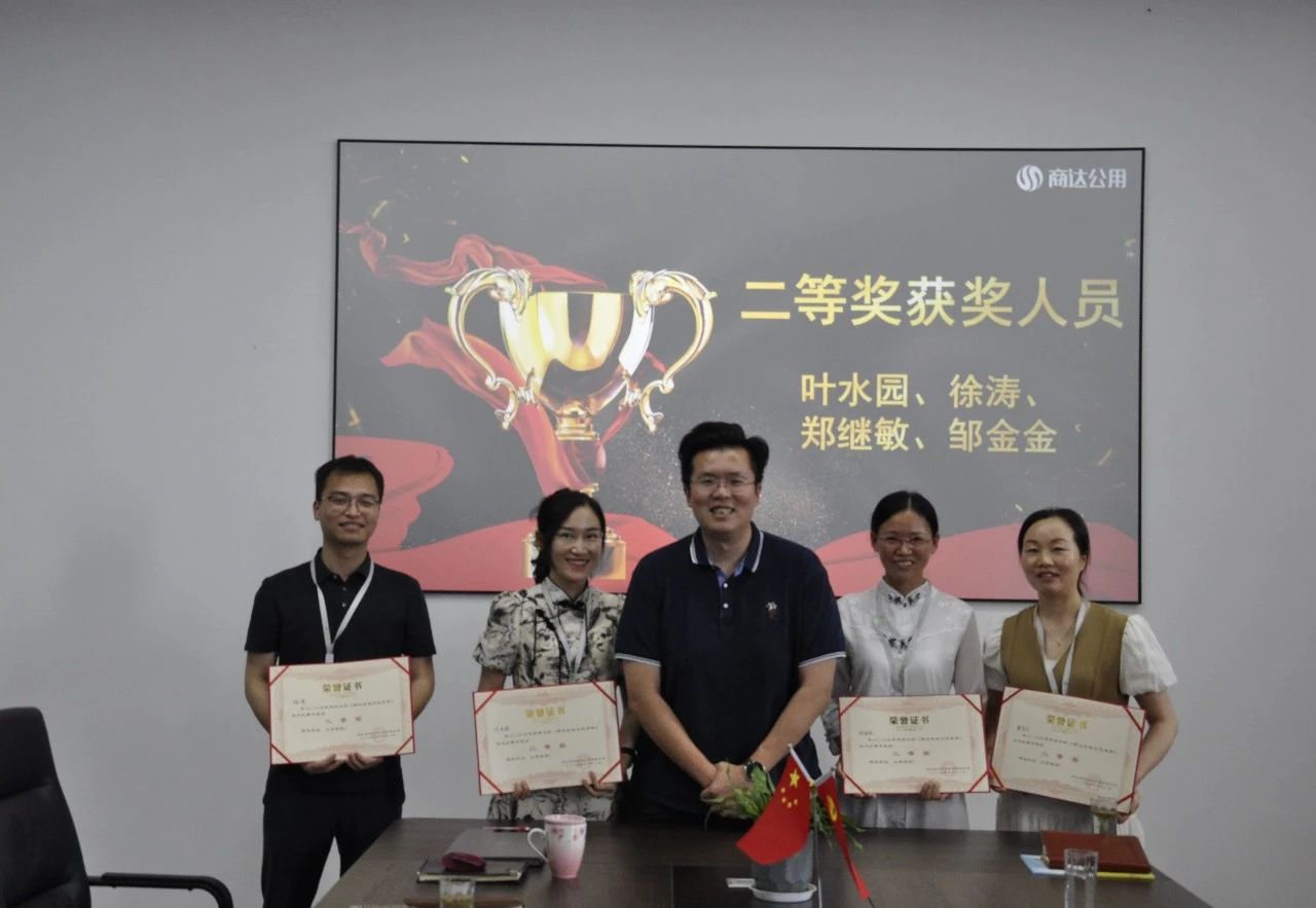 二等獎獲獎人員為總經(jīng)辦葉水園、設(shè)計研究院徐濤、財務(wù)中心鄭繼敏和管理中心鄒金金,商達公用董事長助理張毅為其頒獎。