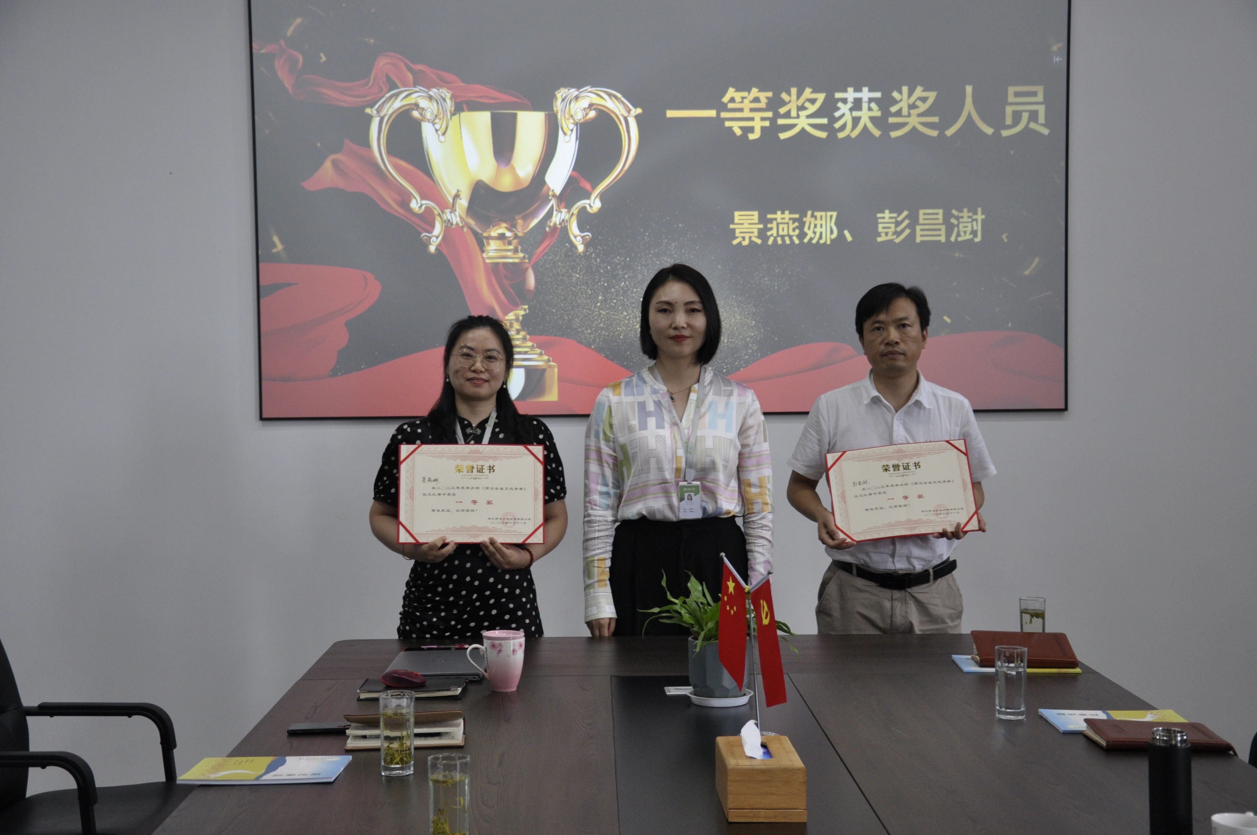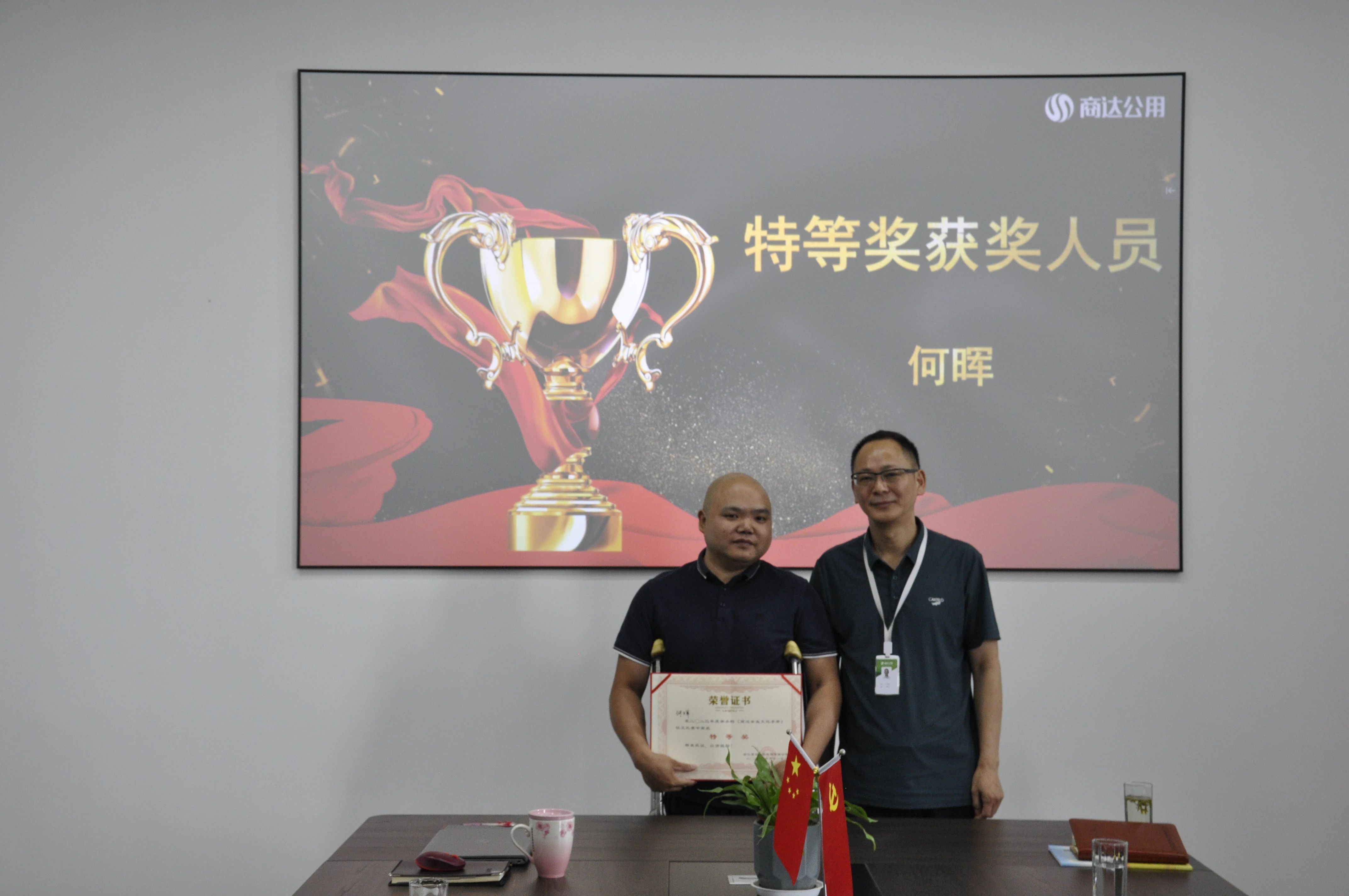一等獎獲獎人員為管理中心彭昌澍與管理中心景燕娜,商達公用總經(jīng)理潘碧文為其頒獎。