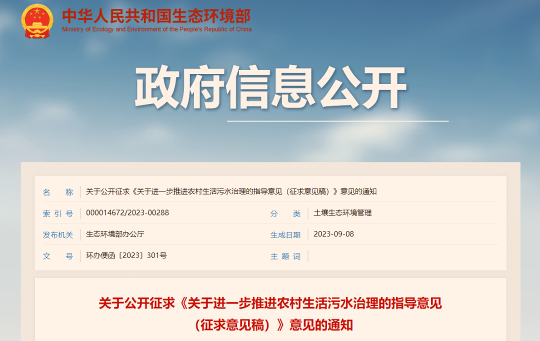 為深入踐行習近平生態(tài)文明思想,貫徹落實黨的二十大關于推進城鄉(xiāng)人居環(huán)境整治、建設宜居宜業(yè)和美鄉(xiāng)村的重要戰(zhàn)略部署,提高農村生活污水治理能力,我部組織編制了《關于進一步推進農村生活污水治理的指導意見(征求意見稿)》,現(xiàn)公開征求意見。征求意見稿及其編制說明,可登錄我部網站(http://www.mee.gov.cn)“意見征集”欄目檢索查閱。