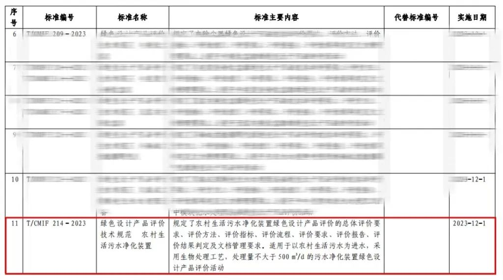 2023年10月10日,中國機(jī)械工業(yè)聯(lián)合會(huì)發(fā)布2023年第4號(hào)公告,批準(zhǔn)17項(xiàng)中國機(jī)械工業(yè)聯(lián)合會(huì)團(tuán)體標(biāo)準(zhǔn)。由商達(dá)公用起草主編的T/CMIF 214-2023《綠色設(shè)計(jì)產(chǎn)品評(píng)價(jià)技術(shù)規(guī)范 農(nóng)村生活污水凈化裝置》名列榜單,自2023年12月1日起實(shí)施。