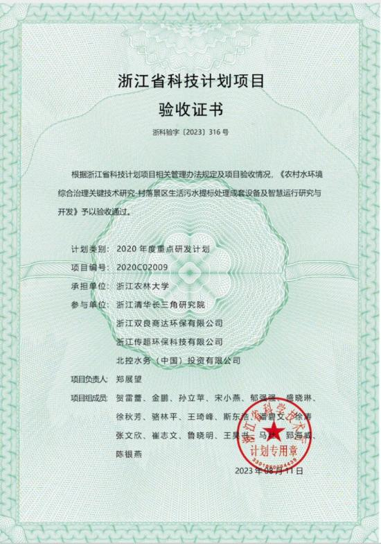 近日,由浙江農(nóng)林大學(xué)主持、浙江清華長三角研究院和浙江商達(dá)公用環(huán)保有限公司等單位參與的浙江省重點(diǎn)研發(fā)計(jì)劃項(xiàng)目“農(nóng)村水環(huán)境綜合治理關(guān)鍵技術(shù)研究-村落景區(qū)生活污水提標(biāo)處理成套設(shè)備及智慧運(yùn)行研究與開發(fā)”(項(xiàng)目編號:2020C02009)順利通過浙江省科技廳組織的驗(yàn)收,并獲頒證書。