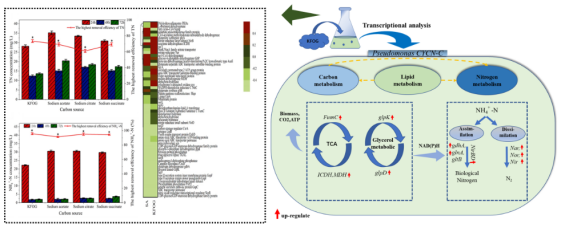 針對(duì)上述問(wèn)題,研究團(tuán)隊(duì)分離并鑒定了一株具有油脂利用和高效脫氮能力的假單胞菌CYCN-C。菌株CYCN-C以KFOG為唯一碳源,TN的去除率可以達(dá)到73.5%。并且利用轉(zhuǎn)錄組技術(shù)分析了菌株CYCN-C分別以KFOG和乙酸鈉為碳源時(shí)的基因表達(dá)情況。結(jié)果顯示,KFOG組中部分基因表達(dá)水平顯著升高,其中包括參與碳代謝的細(xì)胞色素o泛醇氧化酶(cyo)、碳儲(chǔ)存調(diào)節(jié)蛋白基因(CsrA)、聚羥基烷酸酯(PHAs)和延胡索酸酶(FumC)基因分別上調(diào)6.9倍、0.7倍、26.0倍和19.0倍,參與氮代謝的硝酸還原酶(nar)和亞硝酸鹽還原酶(nirB、nirD)基因分別上調(diào)115倍、30倍和49倍,參與脂質(zhì)代謝途徑的脂肪酶(lipA、lipB)、甘油-3-磷酸脫氫酶(glpD)和甘油激酶(glpK)基因分別上調(diào)0.6倍、0.4倍、21.5倍和1.3倍。本研究驗(yàn)證了廢棄油脂作為碳源的可行性,并為該細(xì)菌利用廢棄油脂和脫氮的代謝機(jī)制提供了新的見(jiàn)解。