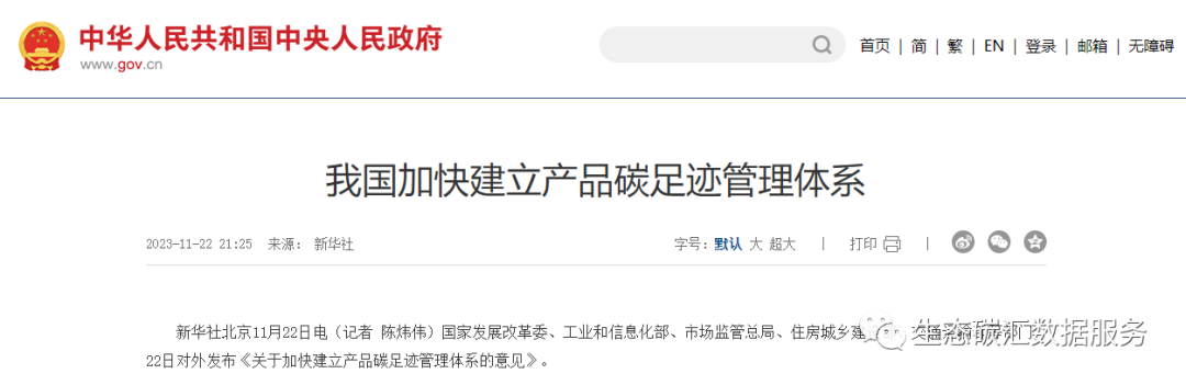 2023年11月22日,國家發(fā)展改革委、工業(yè)和信息化部、市場監(jiān)管總局、住房城鄉(xiāng)建設(shè)部、交通運輸部等部門對外發(fā)布了《關(guān)于加快建立產(chǎn)品碳足跡管理體系的意見》(以下簡稱《意見》),《意見》對產(chǎn)品碳足跡管理各項重點任務(wù)作出系統(tǒng)部署,提出制定產(chǎn)品碳足跡核算規(guī)則標準、加強碳足跡背景數(shù)據(jù)庫建設(shè)、建立產(chǎn)品碳標識認證制度、豐富產(chǎn)品碳足跡應用場景、推動碳足跡國際銜接與互認等工作舉措,并明確了職責分工和保障措施等。