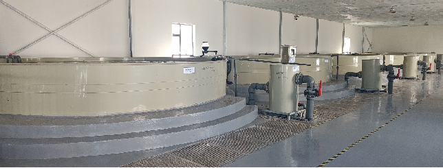 商達公用“碧水漁倉”示范基地采用工廠化循環(huán)水養(yǎng)殖模式,具有標準化、高效化、綠色化、智慧化等特點?;匾还灿?個PP陸基魚池,養(yǎng)殖水方300立方,預計年產(chǎn)量18噸。系統(tǒng)配置有自動水循環(huán)系統(tǒng)、增氧系統(tǒng)、純氧系統(tǒng)、排污系統(tǒng),水溫常年保持在25℃左右。通過環(huán)境參數(shù)采集、無線組網(wǎng)、智能控制、自動預警等,實現(xiàn)集約、高產(chǎn)、生態(tài)、安全養(yǎng)殖。