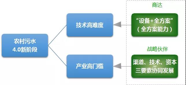 但是,農(nóng)村污水屬于政府類項目,是個高門檻的行業(yè),除了技術要素以外,渠道、資本也是關鍵要素。渠道是拿到項目的關鍵,而投融資能力則是保障項目順利實施的重要基礎。因此,渠道、技術、資本成為農(nóng)村污水處理產(chǎn)業(yè)新生態(tài)中的三要素。要想真正把項目做好,需要各方參與共生發(fā)展。