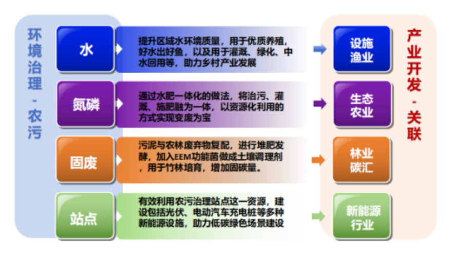 該理念是基于綠色鄉(xiāng)村 EOD 價(jià)值體系,通過機(jī)制、技術(shù)創(chuàng)新,將農(nóng)污治理與鄉(xiāng)村振興相關(guān)綠色農(nóng)業(yè)、設(shè)施漁業(yè)、碳中和、新能源等產(chǎn)業(yè)相融合,建立“生態(tài)、生產(chǎn)、生活”三生共融的生態(tài)治理模式并融合以“需求拉動(dòng)、供給推動(dòng)、貿(mào)易聯(lián)動(dòng)”為核心驅(qū)動(dòng)的高效生態(tài)產(chǎn)業(yè)發(fā)展,堅(jiān)持生態(tài)優(yōu)先、綠色發(fā)展,通過治理農(nóng)村生活污水,營造清澈鄉(xiāng)村視界實(shí)現(xiàn)“水清岸綠、魚翔淺底”,變“生態(tài)包袱”為“綠色財(cái)富”