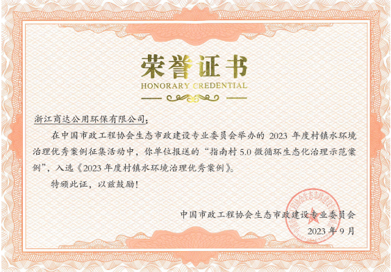 《全國村鎮(zhèn)污水治理優(yōu)秀案例》榮譽(yù)證書