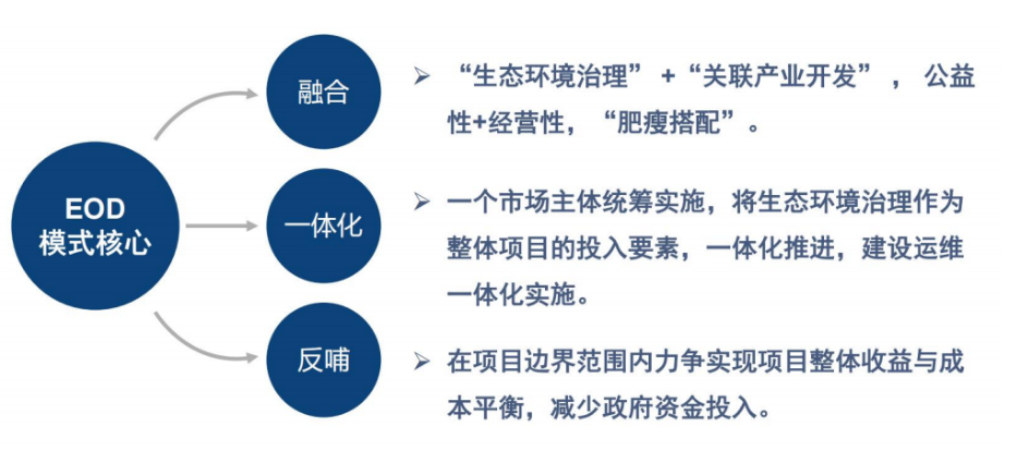 基于項(xiàng)目實(shí)踐的EOD模式,通過融合化和一體化來實(shí)現(xiàn)實(shí)現(xiàn)產(chǎn)業(yè)反哺,緩解項(xiàng)目資金問題,減少政府債務(wù)負(fù)擔(dān),充分將綠色項(xiàng)目的經(jīng)濟(jì)效益與環(huán)境效益相結(jié)合,“綠水青山”與“金山銀山”相統(tǒng)籌。