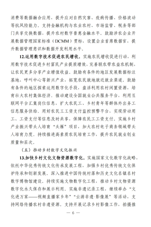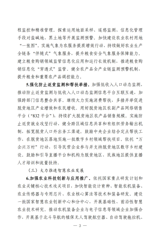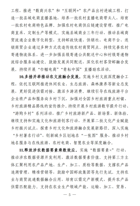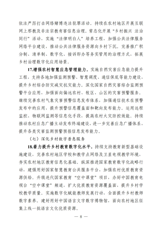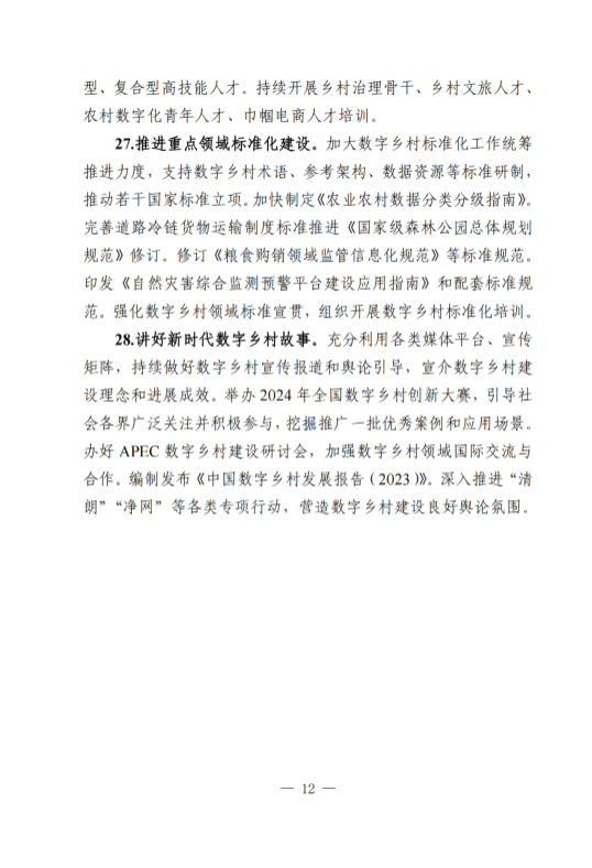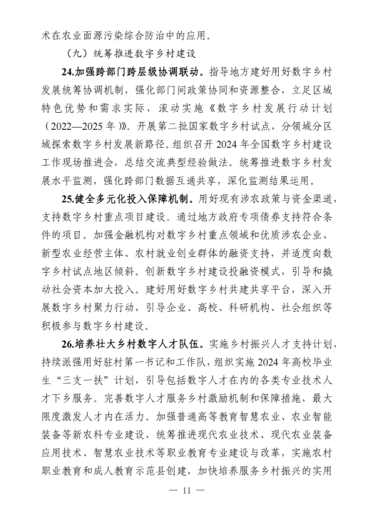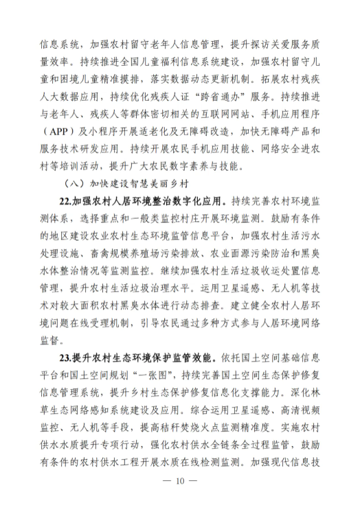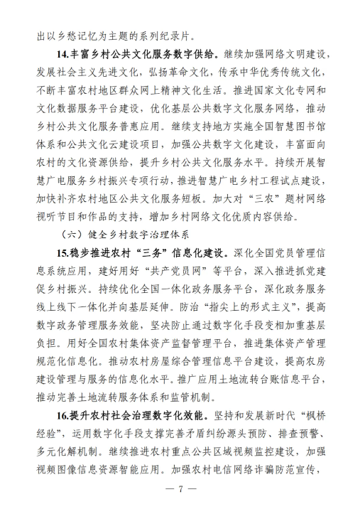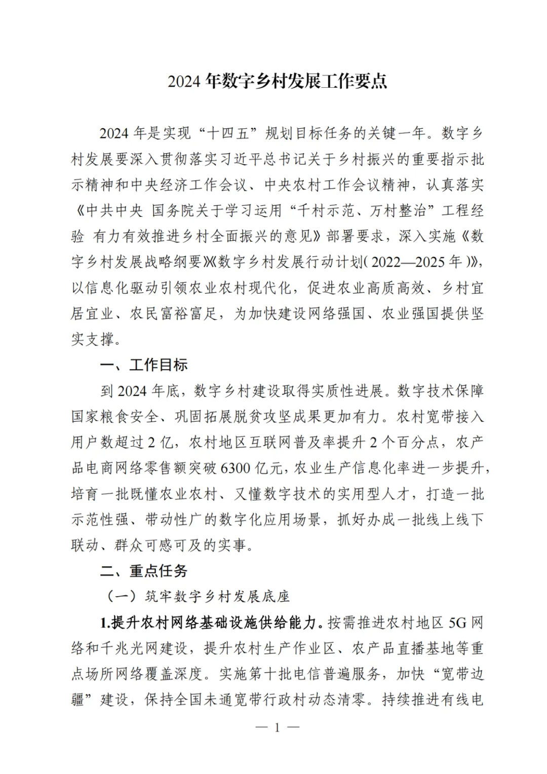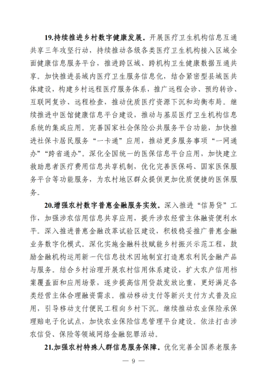 《工作要點》部署了9個方面28項重點任務(wù)。一是筑牢數(shù)字鄉(xiāng)村發(fā)展底座。包括提升農(nóng)村網(wǎng)絡(luò)基礎(chǔ)設(shè)施供給能力,加大農(nóng)村基礎(chǔ)設(shè)施改造升級力度,加快推進涉農(nóng)數(shù)據(jù)資源集成共享。二是以數(shù)字化守牢“兩條底線”。包括強化確保糧食安全數(shù)字化支撐,強化防止返貧監(jiān)測和幫扶舉措。三是大力推進智慧農(nóng)業(yè)發(fā)展。包括加強農(nóng)業(yè)科技創(chuàng)新與應(yīng)用推廣,提升農(nóng)業(yè)全產(chǎn)業(yè)鏈數(shù)字化水平,以數(shù)字技術(shù)深化農(nóng)業(yè)社會化服務(wù)。四是激發(fā)縣域數(shù)字經(jīng)濟新活力。包括加快推進農(nóng)村電商高質(zhì)量發(fā)展,多措并舉推動農(nóng)文旅融合發(fā)展,釋放涉農(nóng)數(shù)據(jù)要素乘數(shù)效應(yīng),運用數(shù)字技術(shù)促進農(nóng)民增收。五是推動鄉(xiāng)村數(shù)字文化振興。包括加快鄉(xiāng)村文化文物資源數(shù)字化,豐富鄉(xiāng)村公共文化服務(wù)數(shù)字供給。六是健全鄉(xiāng)村數(shù)字治理體系。包括穩(wěn)步推進農(nóng)村“三務(wù)”信息化建設(shè),提升農(nóng)村社會治理數(shù)字化效能,增強農(nóng)村智慧應(yīng)急管理能力。七是深化鄉(xiāng)村數(shù)字普惠服務(wù)。包括著力提升鄉(xiāng)村教育數(shù)字化水平,持續(xù)推進鄉(xiāng)村數(shù)字健康發(fā)展,增強農(nóng)村數(shù)字普惠金融服務(wù)實效,加強農(nóng)村特殊人群信息服務(wù)保障。八是加快建設(shè)智慧美麗鄉(xiāng)村。包括加強農(nóng)村人居環(huán)境整治數(shù)字化應(yīng)用,提升農(nóng)村生態(tài)環(huán)境保護監(jiān)管效能。九是統(tǒng)籌推進數(shù)字鄉(xiāng)村建設(shè)。包括加強跨部門跨層級協(xié)調(diào)聯(lián)動,健全多元化投入保障機制,培養(yǎng)壯大鄉(xiāng)村數(shù)字人才隊伍,推進重點領(lǐng)域標準化建設(shè),講好新時代數(shù)字鄉(xiāng)村故事。